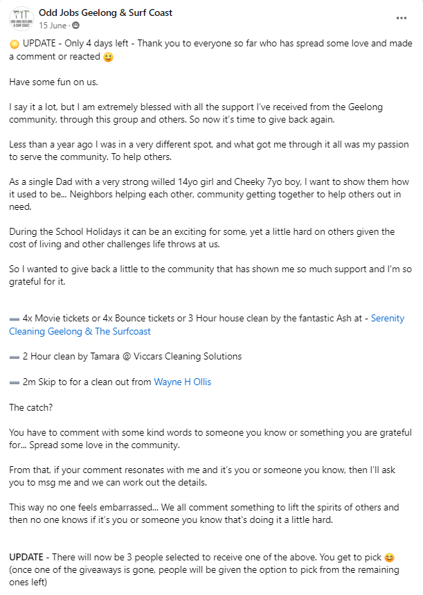 Once a month I will be helping someone out within the community doing it hard. Often our most vulnerable are left behind and forgotten about, so lets help those in need and give them the best gift anyone could get, our time.